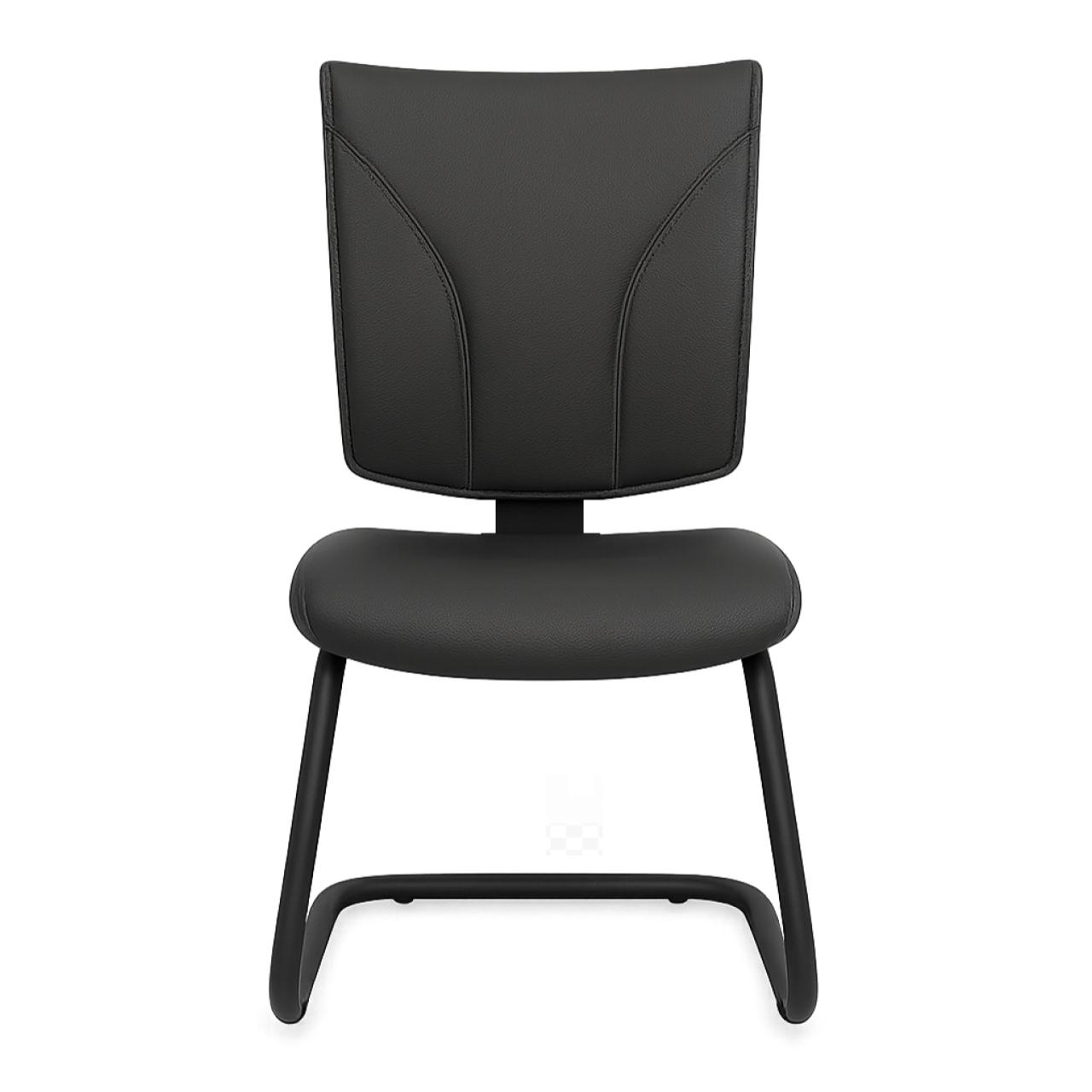 Corino preto (couro sintético), costura aparente com acabamento elegante e resistente.