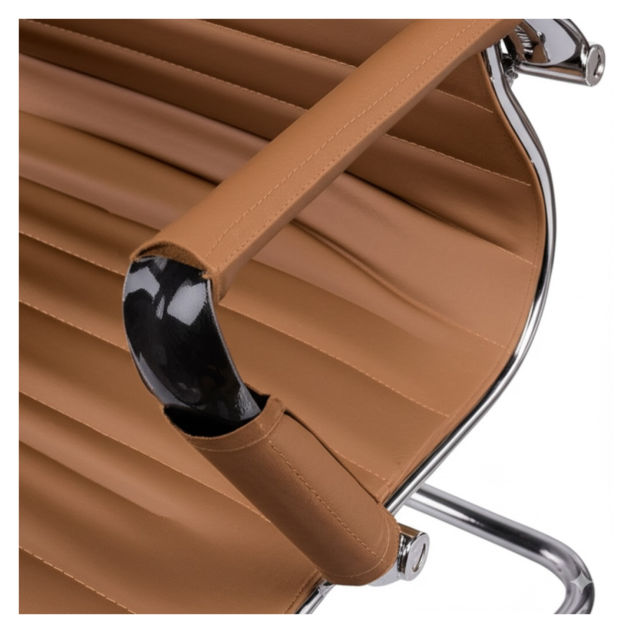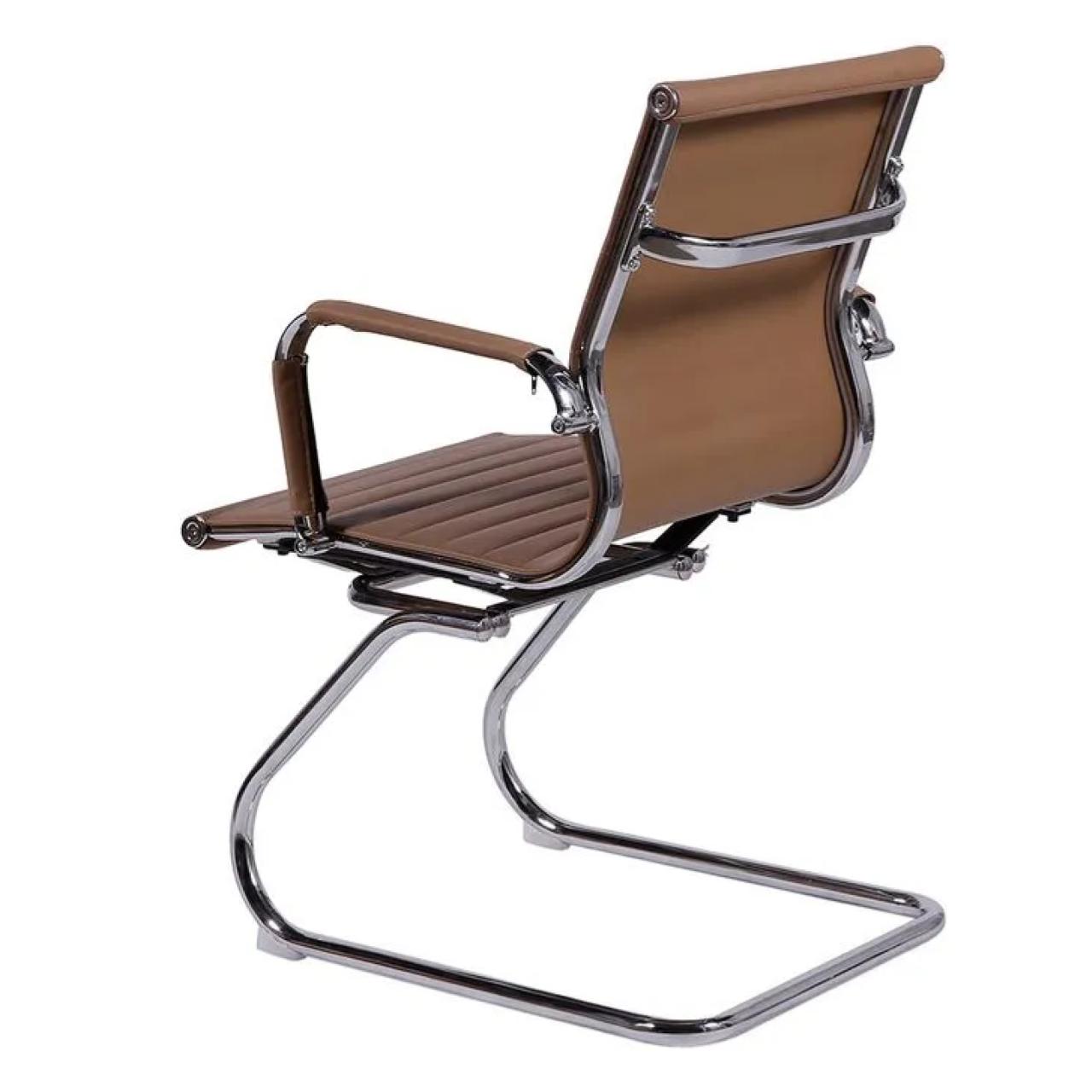 Braços: Integrados à estrutura da base, também em aço cromado, com apoios revestidos no mesmo material do assento e encosto, oferecendo conforto e um visual harmonioso.