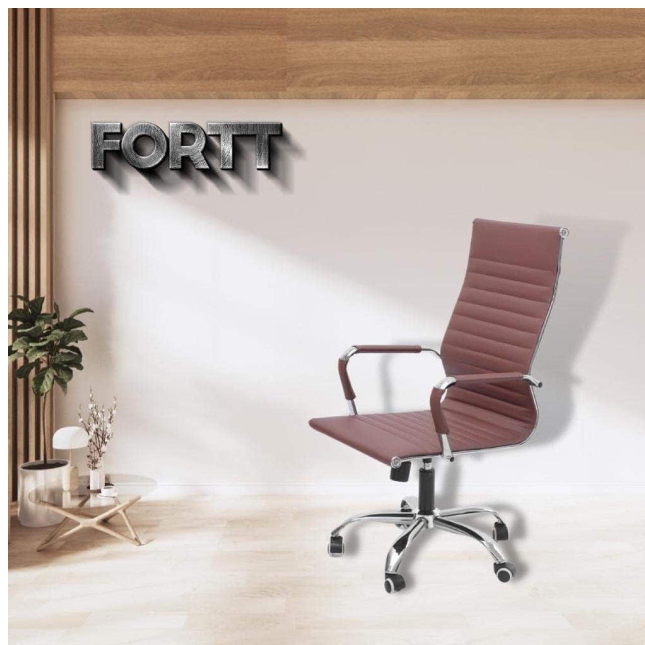 Formato: Cadeira giratória com encosto alto e braços fixos.