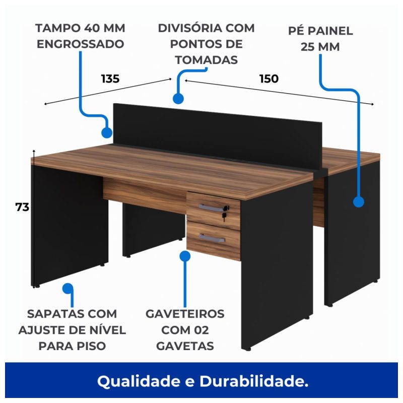 Plataforma de Trabalho 1,50×1,35m 02 Lugares c/ Gavetas c/ ponto de tomada Nogal Sevilha – 63088