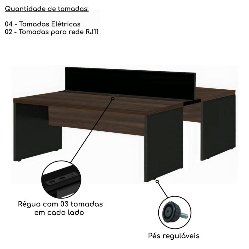 Outros Recursos / Mais informações: Pés niveladores de altura, 02 tomadas de rede e 04 tomadas de energia, 02 Gavetas com tranca.