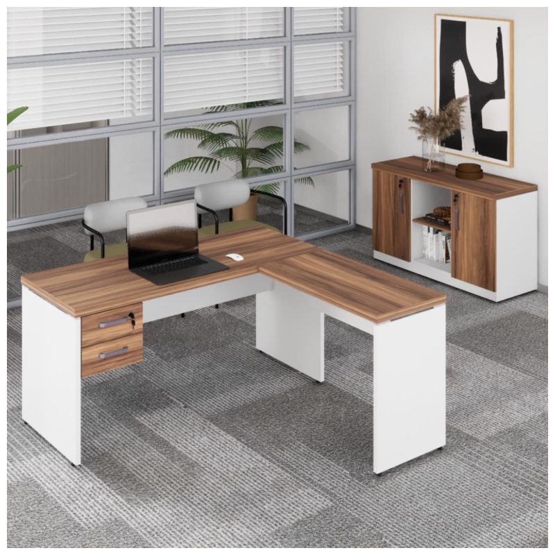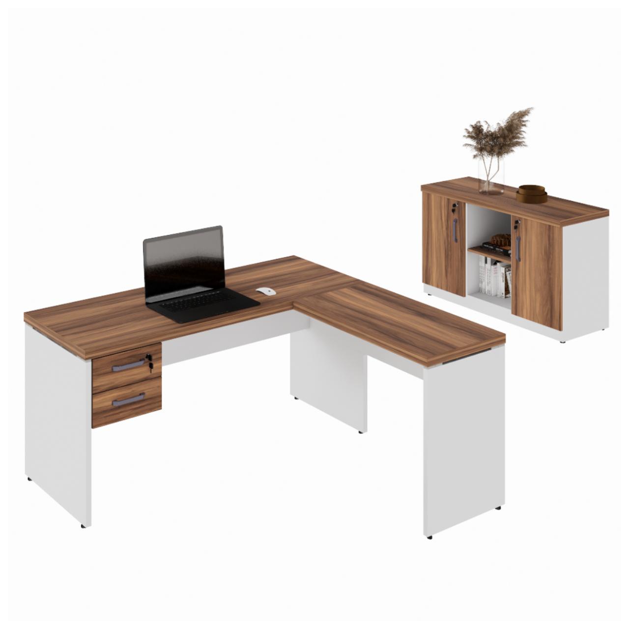 Kit Mesa Escritório em “L” 1,70×0,60m c/ Gavetas + Armário Baixo Credenza – WORKSTART – NOGAL SEVILHA/BRANCO – 34338