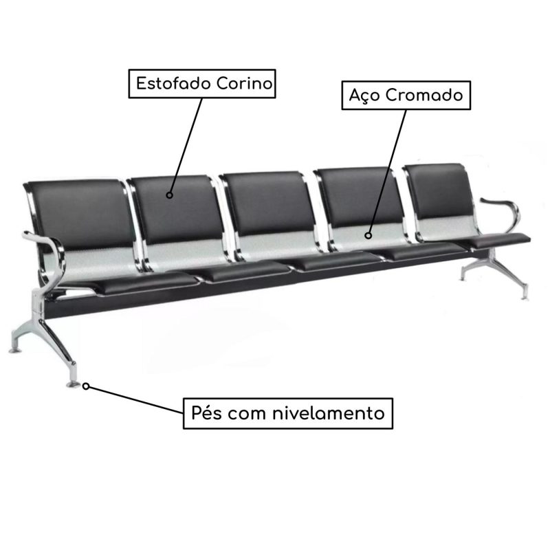 Longarina AEROPORTO ESTOFADA com 05 Lugares – Cor Cromada – PMD – 33114