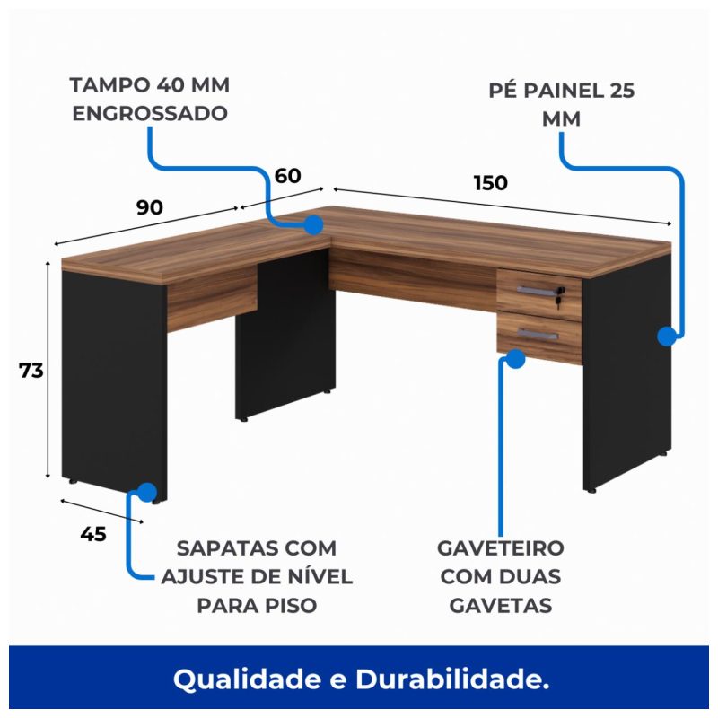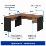 Produto: Mesa de Escritório em L com Gavetas – Mesa 1,50m + Mesa Auxiliar NOGAL SEVILHA/PRETO – 21477