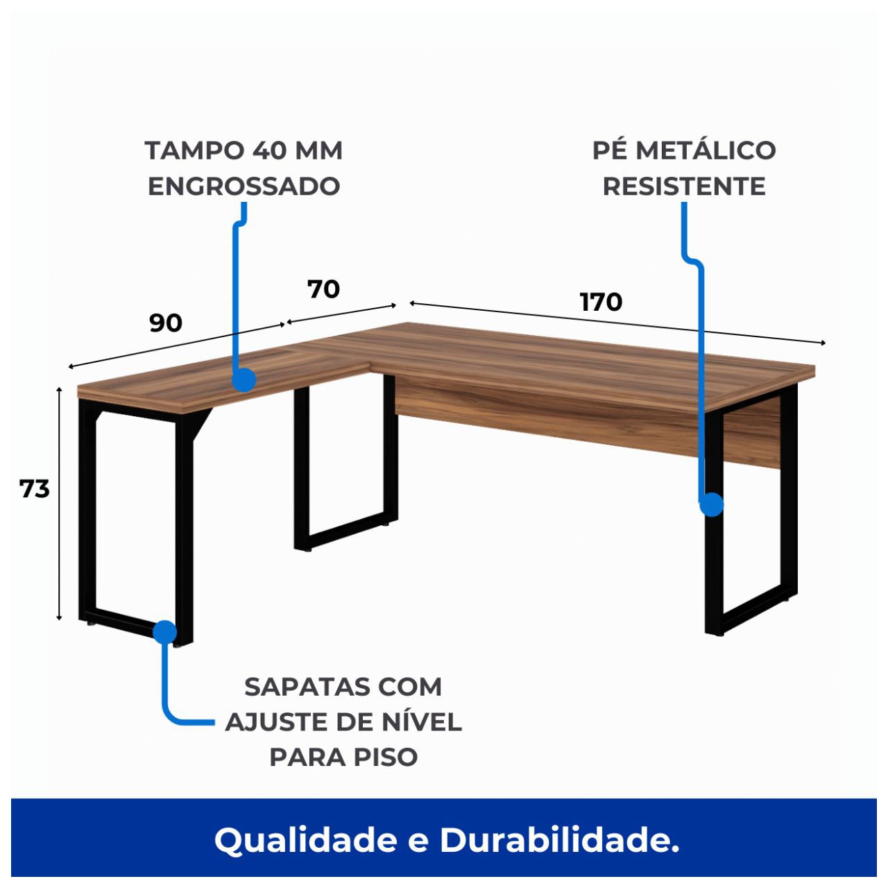 Mesa em L PÉ QUADRO (Mesa 1,70m + Mesa Auxiliar) – S/ Gavetas NOGAL SEVILHA/PRETO – 24478