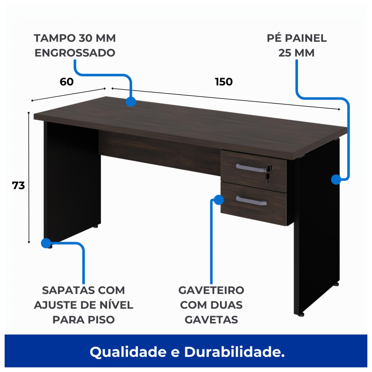 Material do Tampo: MDP de 30mm com Revestimento Melamínico de Baixa Pressão (BP)