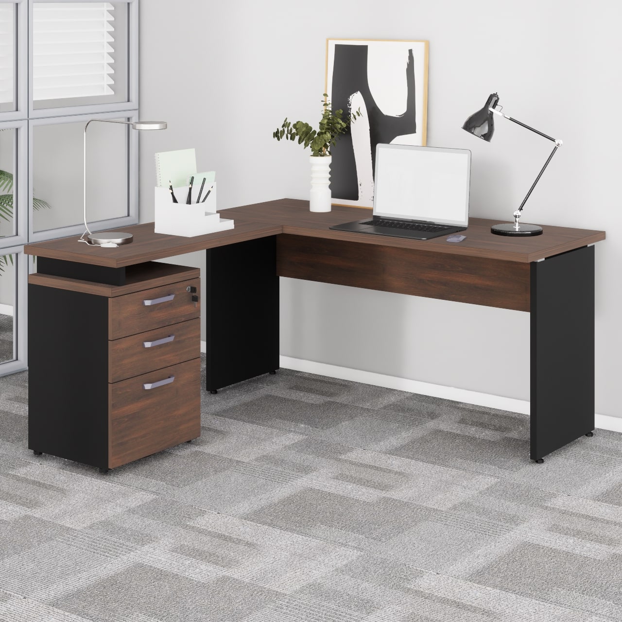 Produto: Mesa Escritório em “L” c/ Gaveteiro 1,50×1,50m MARSALA/PRETO – 23480